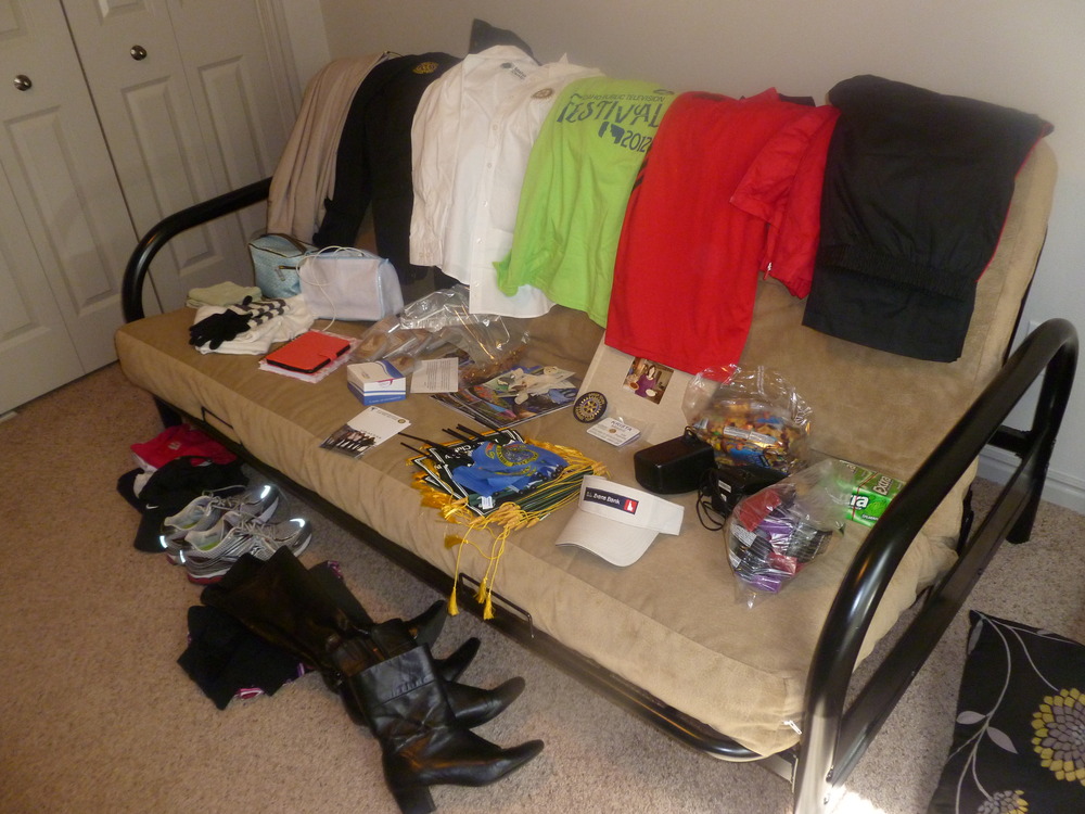 Hoy estoy empezando a empacar como salemos el viernes (la foto ensena algunas de mis cosas). Todav??a no he sacado mucha ropa de mi armario, pero me siento como voy a traer demasiado a Argentina. Necesito traer ropa de nuestros uniformes del equipo de Rotary, ropa y cosas personales, regalos y recuerdos de Idaho y muchas cosas de tecnolog??a (mi computadora, Kindle, ipod, etc.).