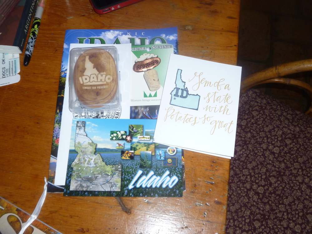 Below are photos of what I am giving to my host families as an example. I am giving them a photo book about Idaho, a deck of Idaho potato cards, an Idaho potato cork and a special Idaho note card. We were fortunate that the talented team at www.1canoe2.com made a special run of the Idaho cards just for our trip. They are so cute!